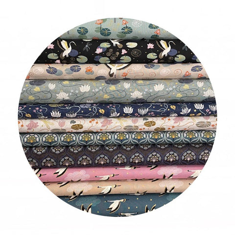 A grand lake in a French chateau with flying herons and blossoming lilies. The stars reflect from the night sky. This is our first Art Nouveau inspired collection and each fabric has gold metallic elements.
